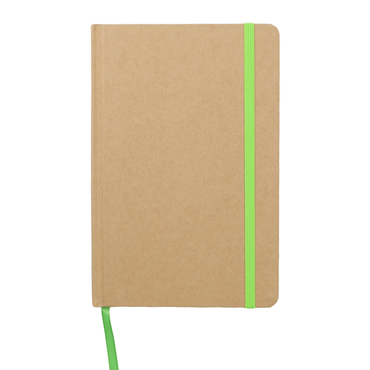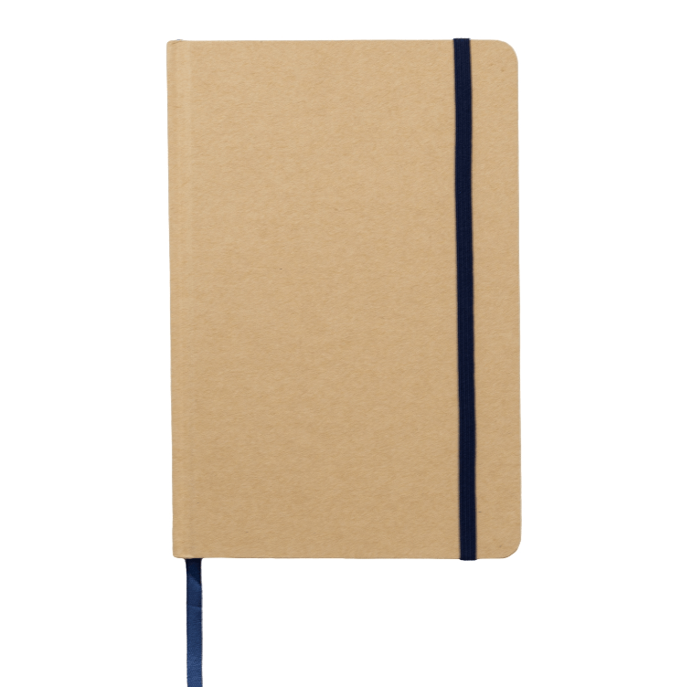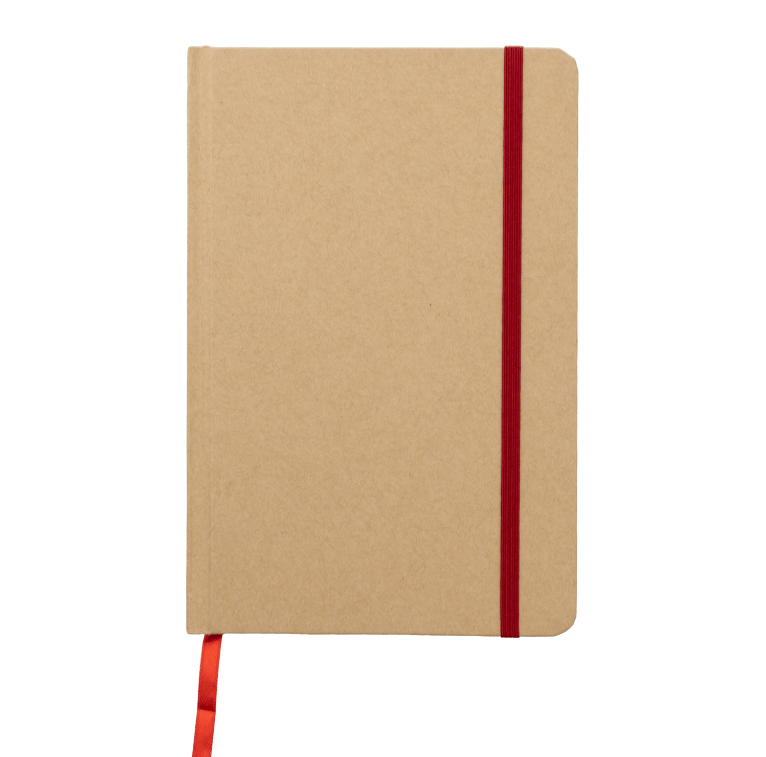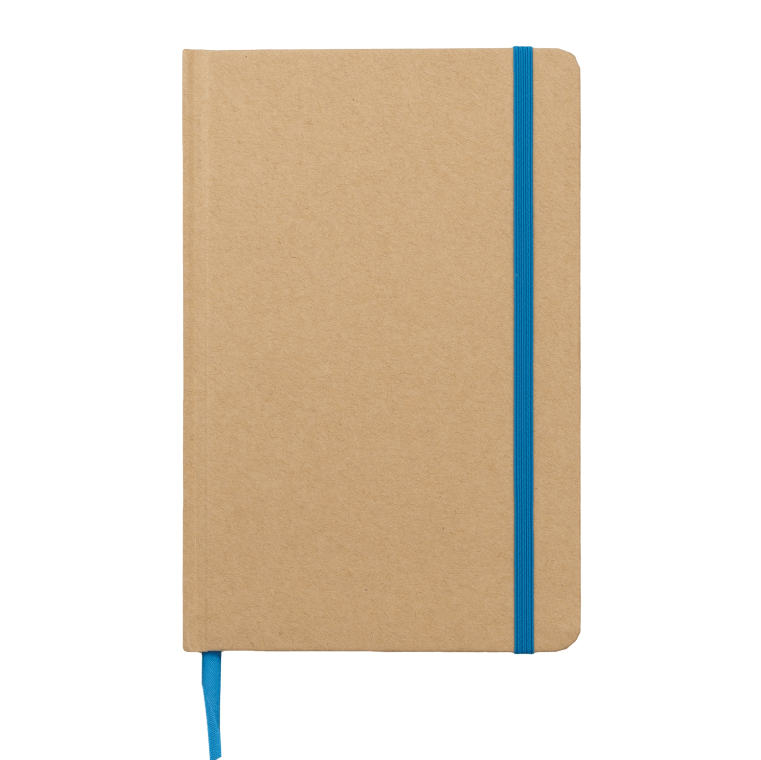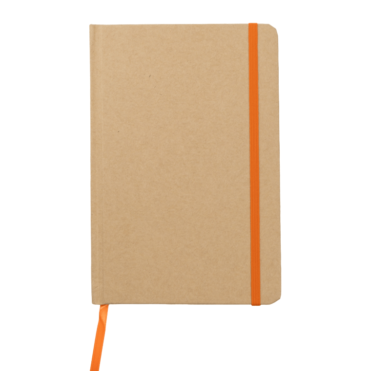 Recycled Kraft Hardcover Notebook with coloured elastic closure and matching coloured page marker. 80 Lined Sheets of paper are provided in this recycled notebook.