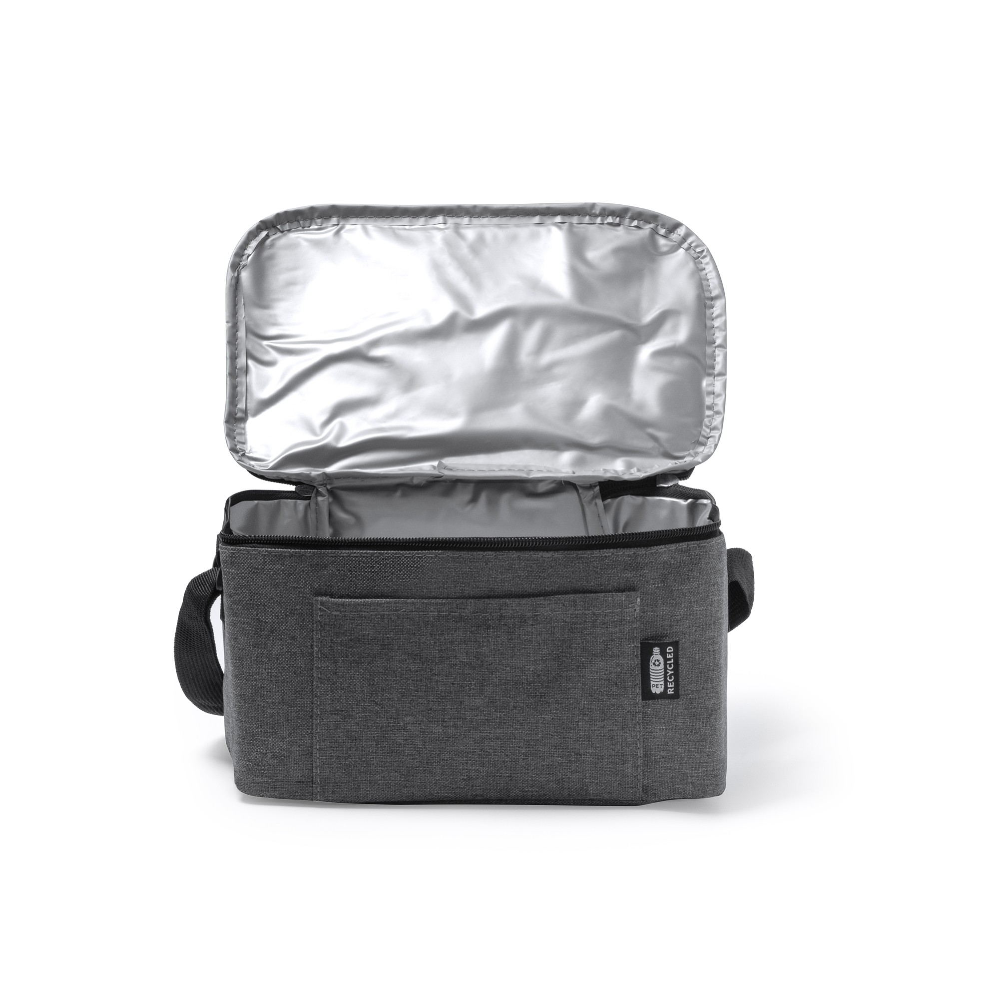 Cooler bag made of RPET polyester in a heather design. Isothermic lining and front pocket. Keep your drinks and food cool and carry them everywhere.
