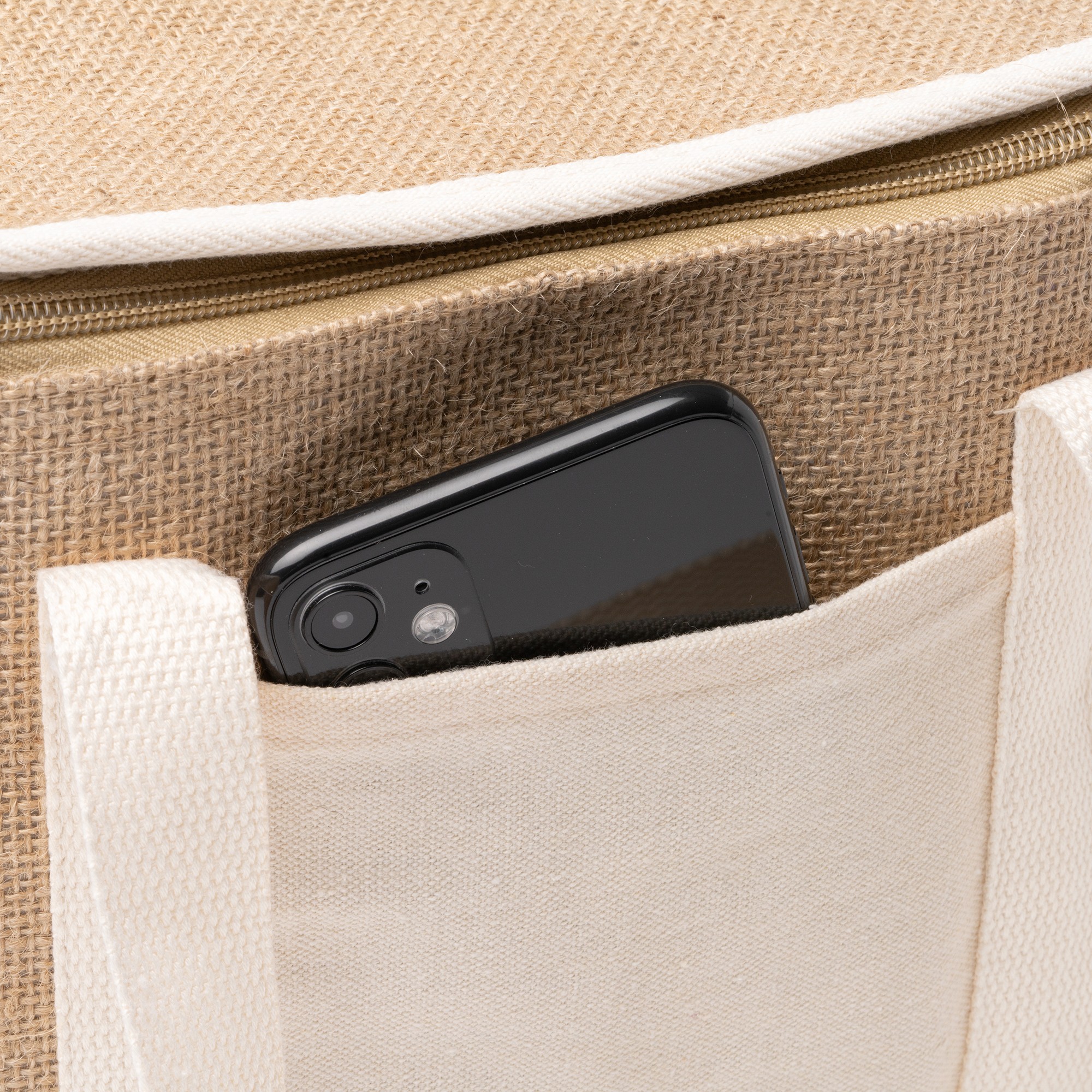 Yute cooler bag with cotton front pocket. Main compartment with isothermal lining in aluminium finish. Carry cotton handles included.