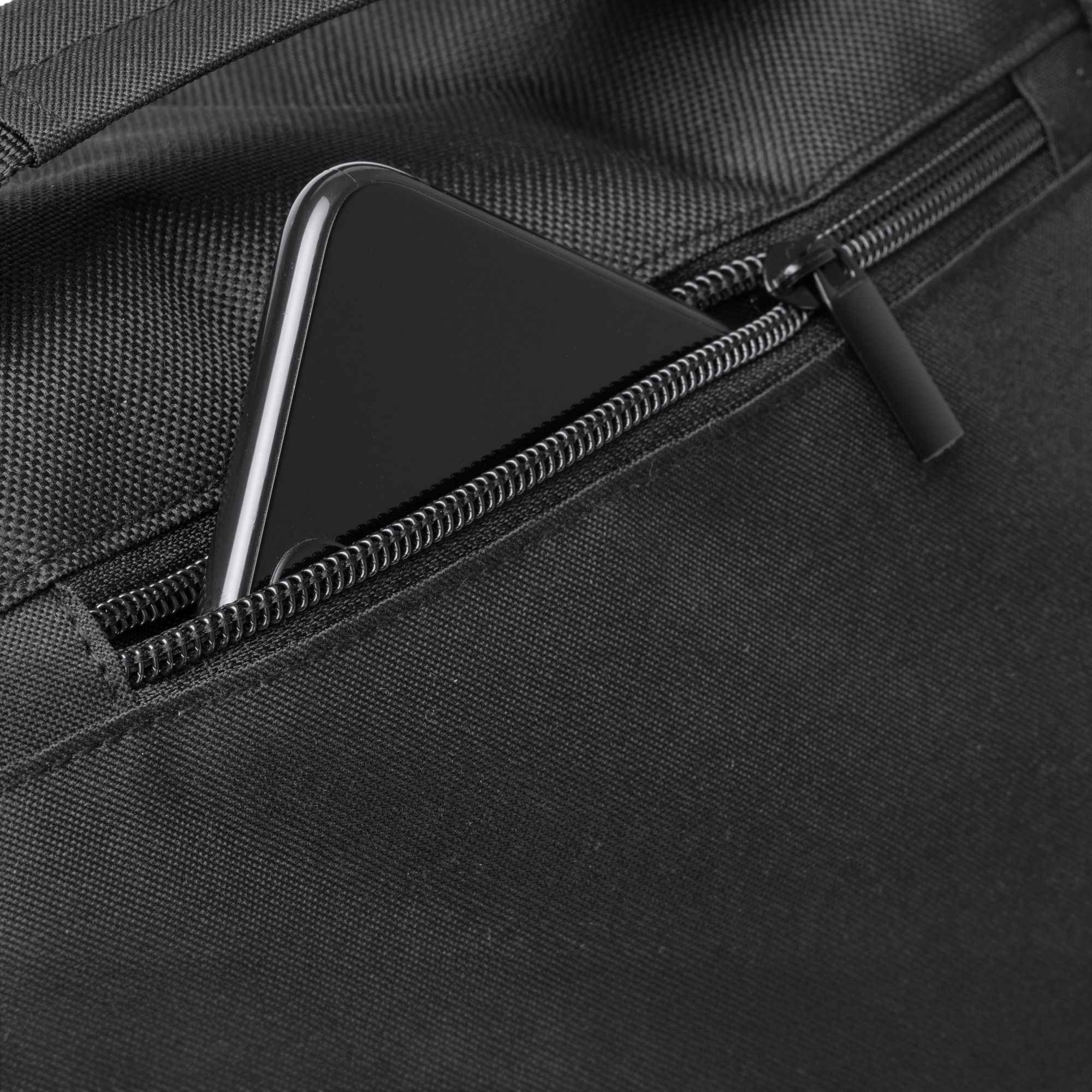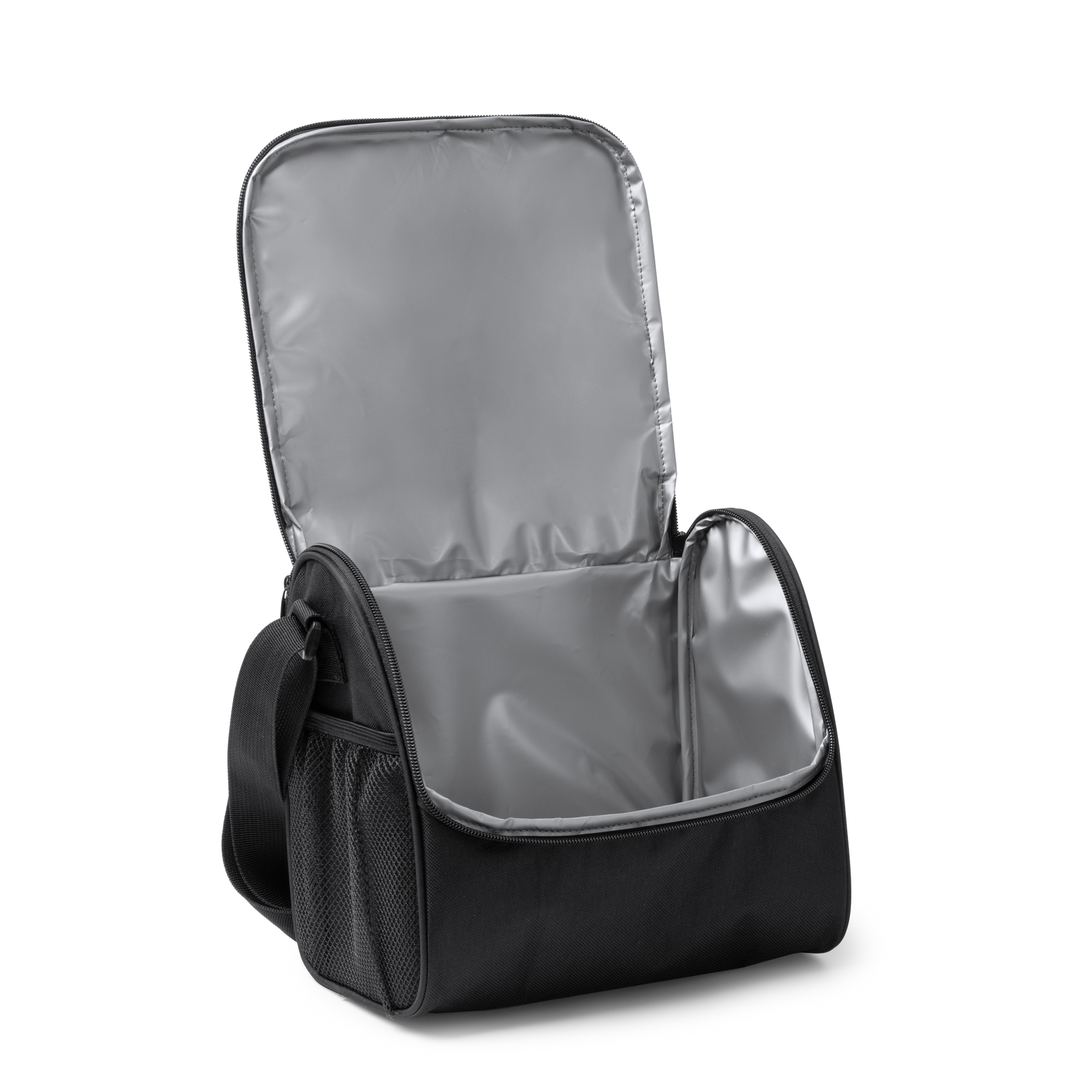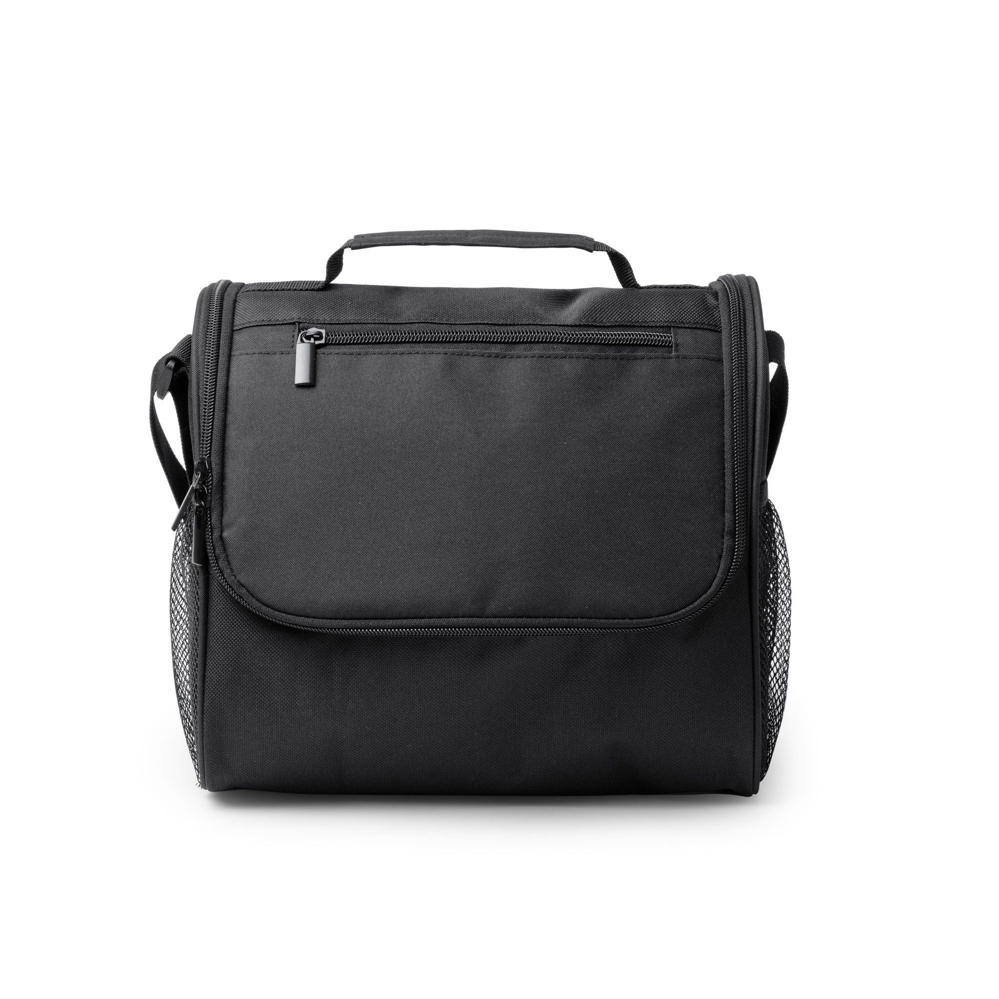 Cooler made of 600D RPET. Main pocket with isothermal interior. Front pocket with zip closure and 2 side pockets. Adjustable carrying strap.