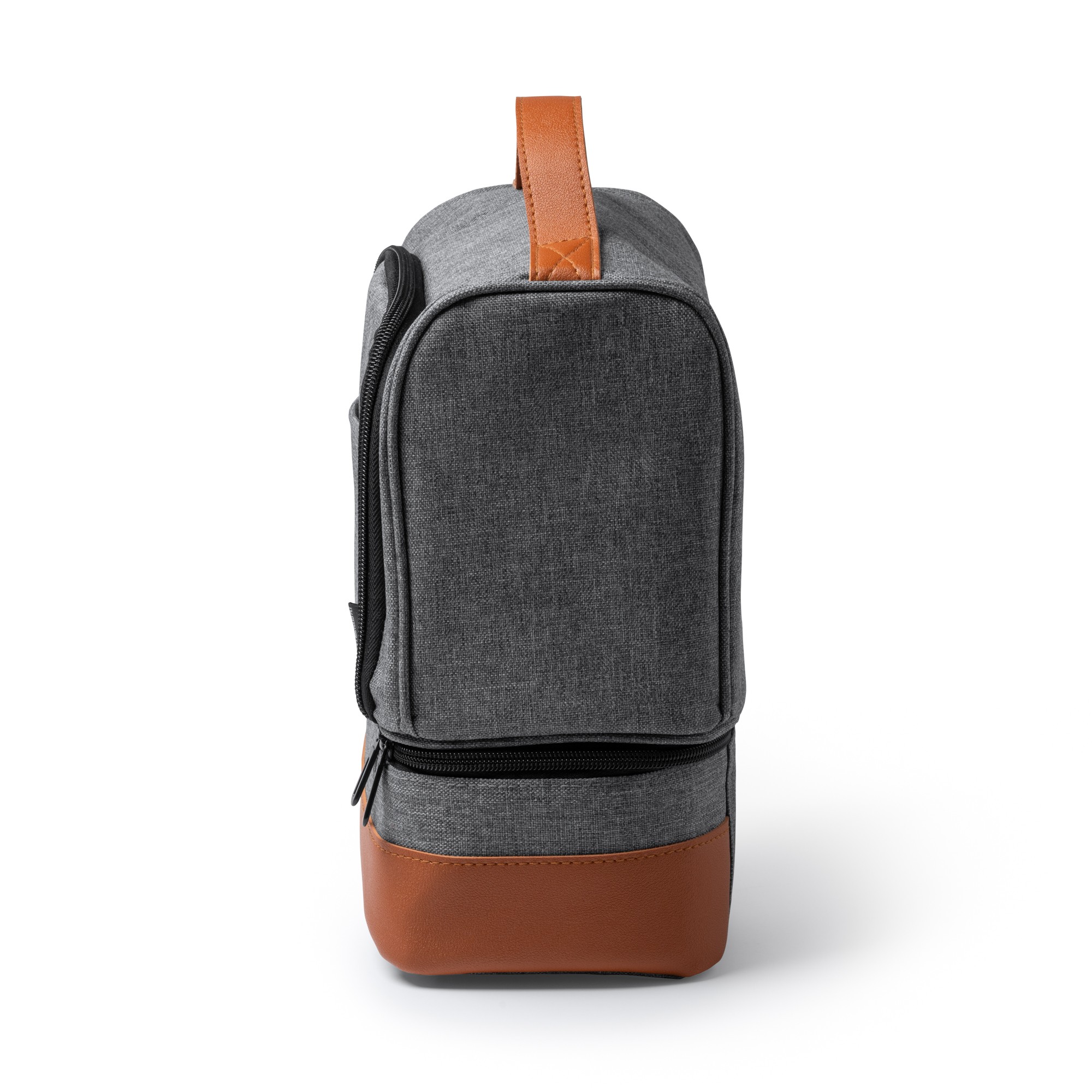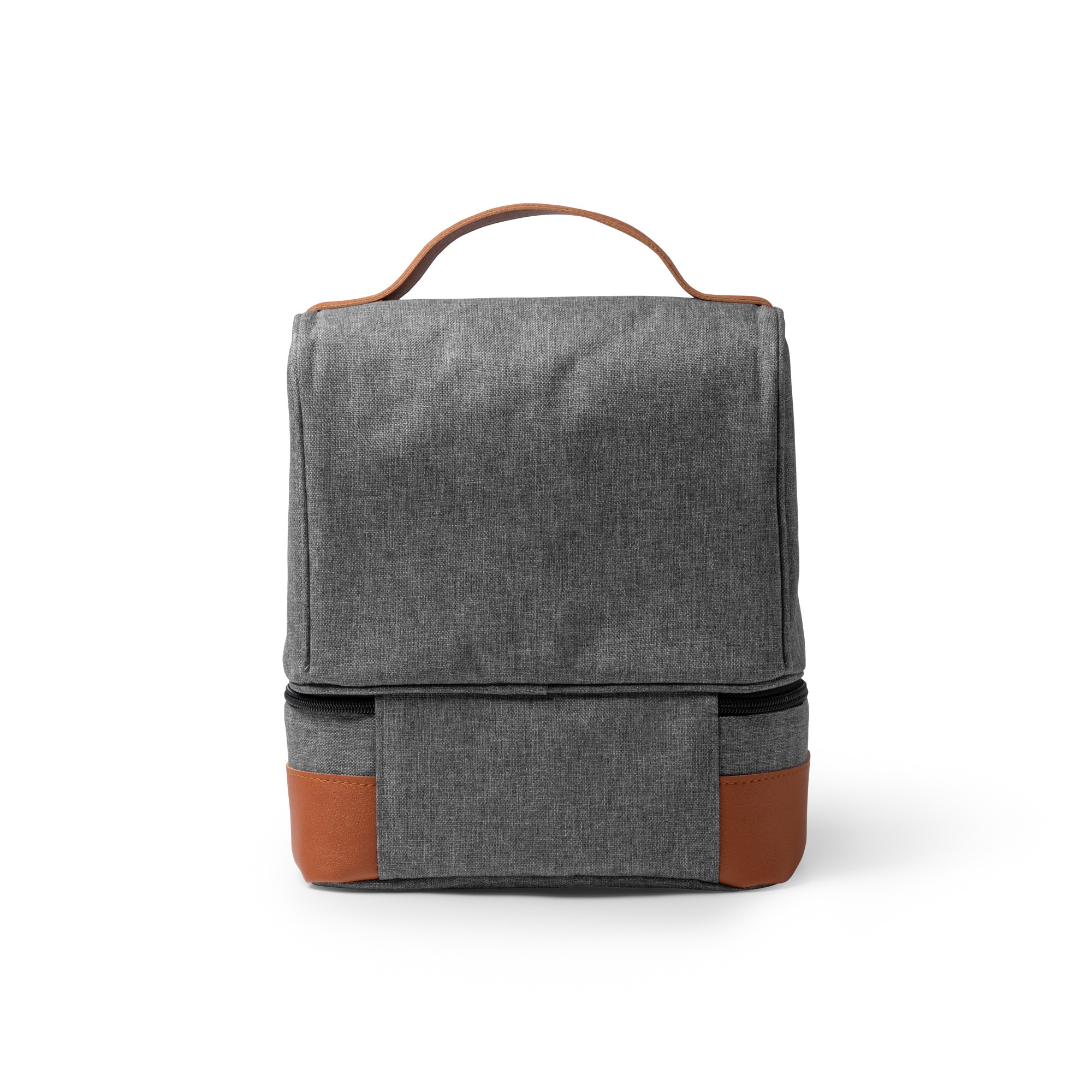 Cooler bag in heather design RPET polyester. Double independent compartments with zip fastening and isothermal lining. Carry handles and PU leather base.