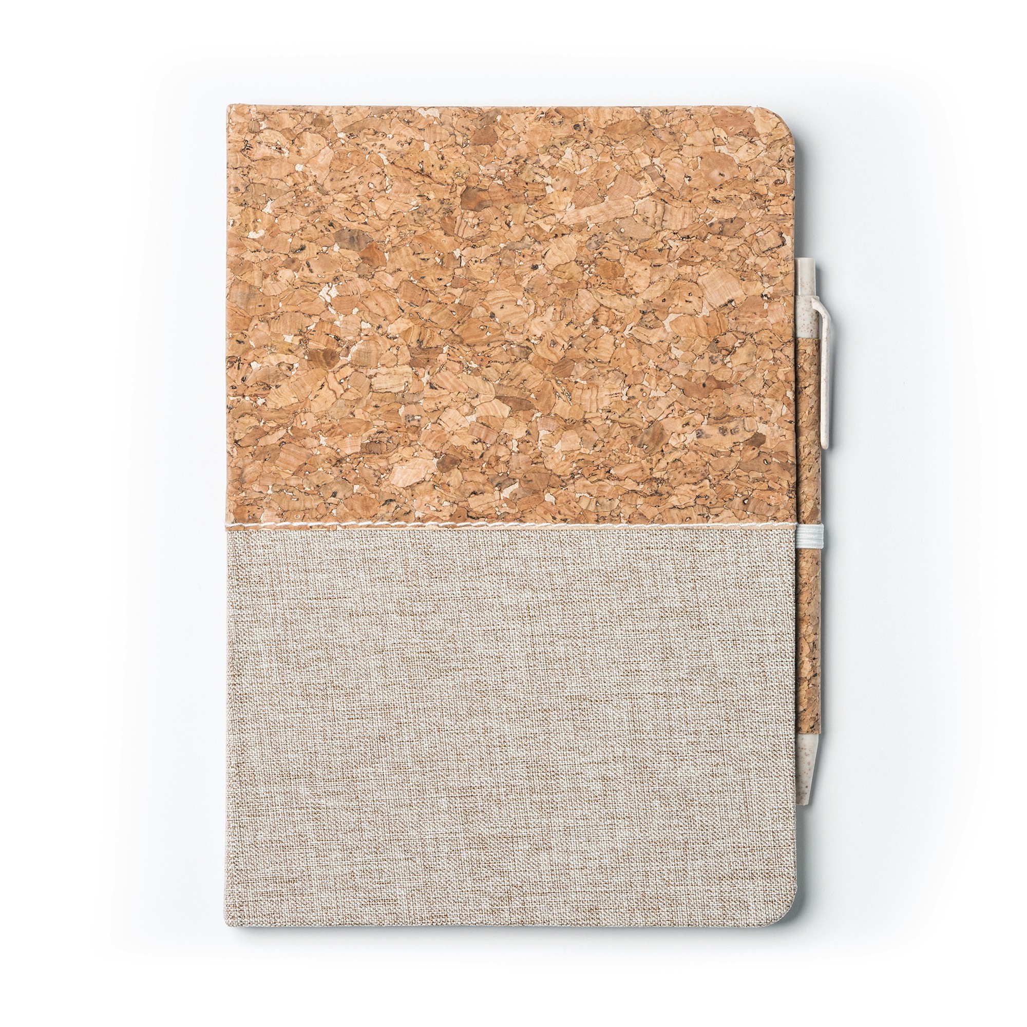 A5 notebook with hard covers in cork and cotton. 80 plain sheets. Cork and wheat fibre pen in matching pen holder included.