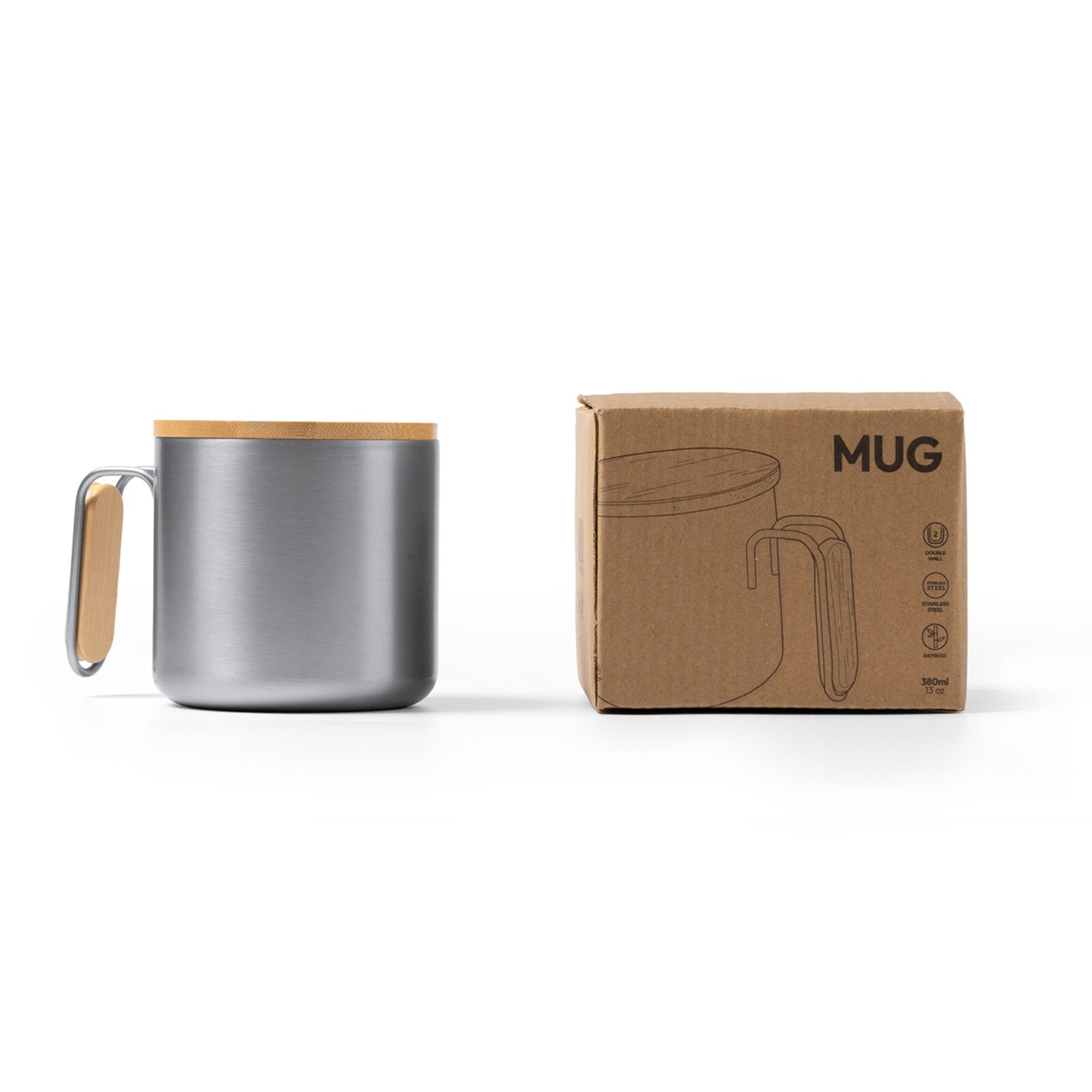 Recycled 304 stainless steel mug with bamboo detail in the handle. 350 ml capacity. Presentationin eco design box.