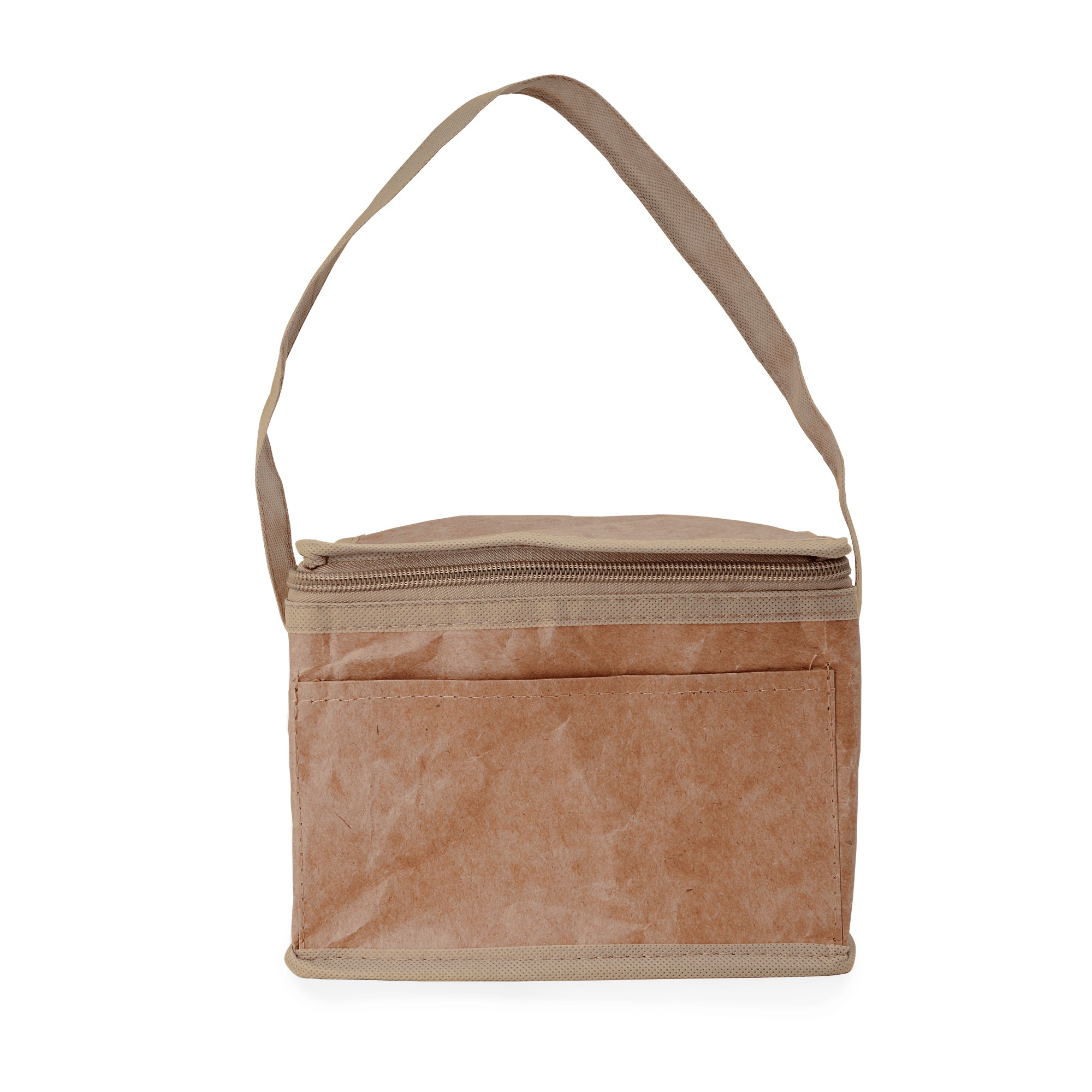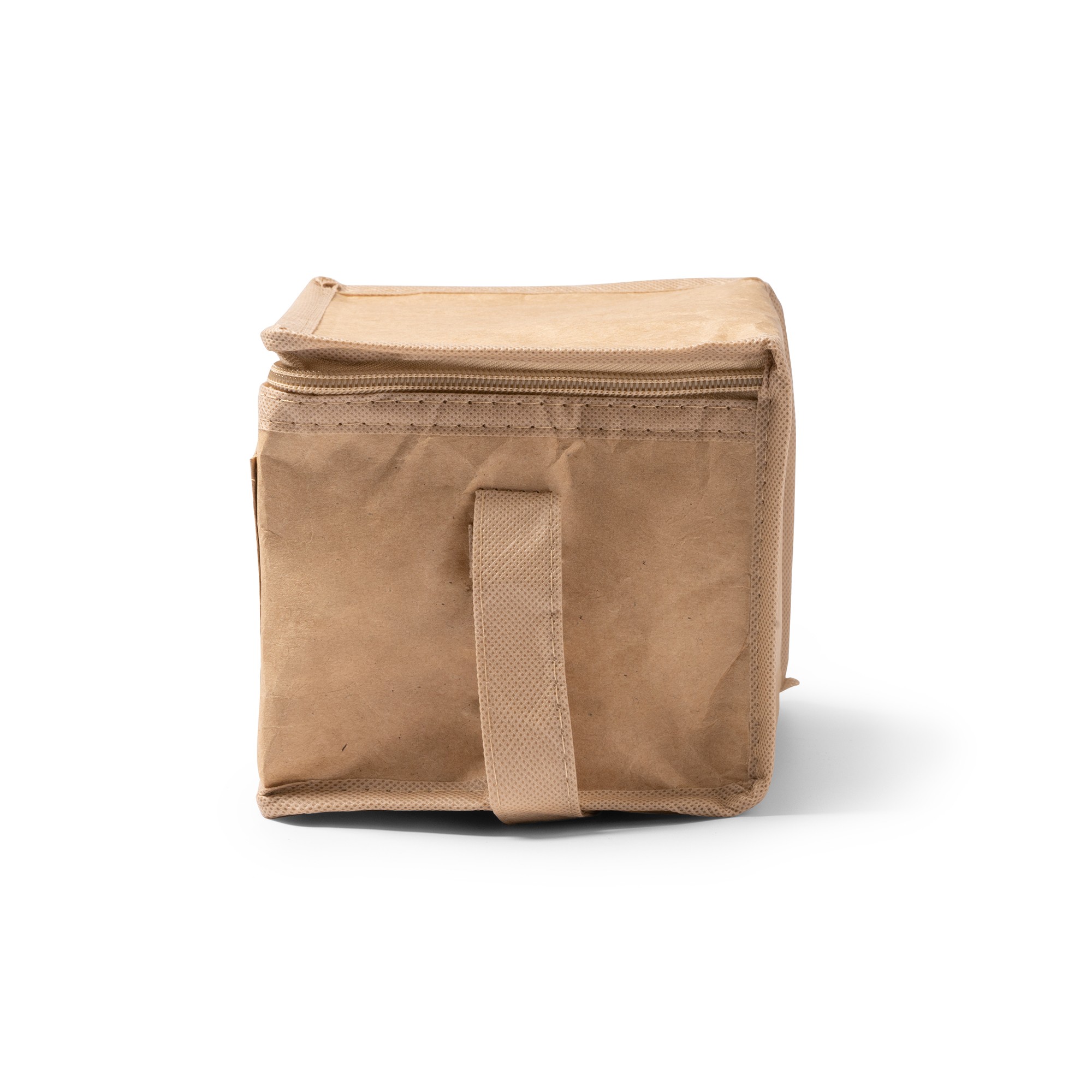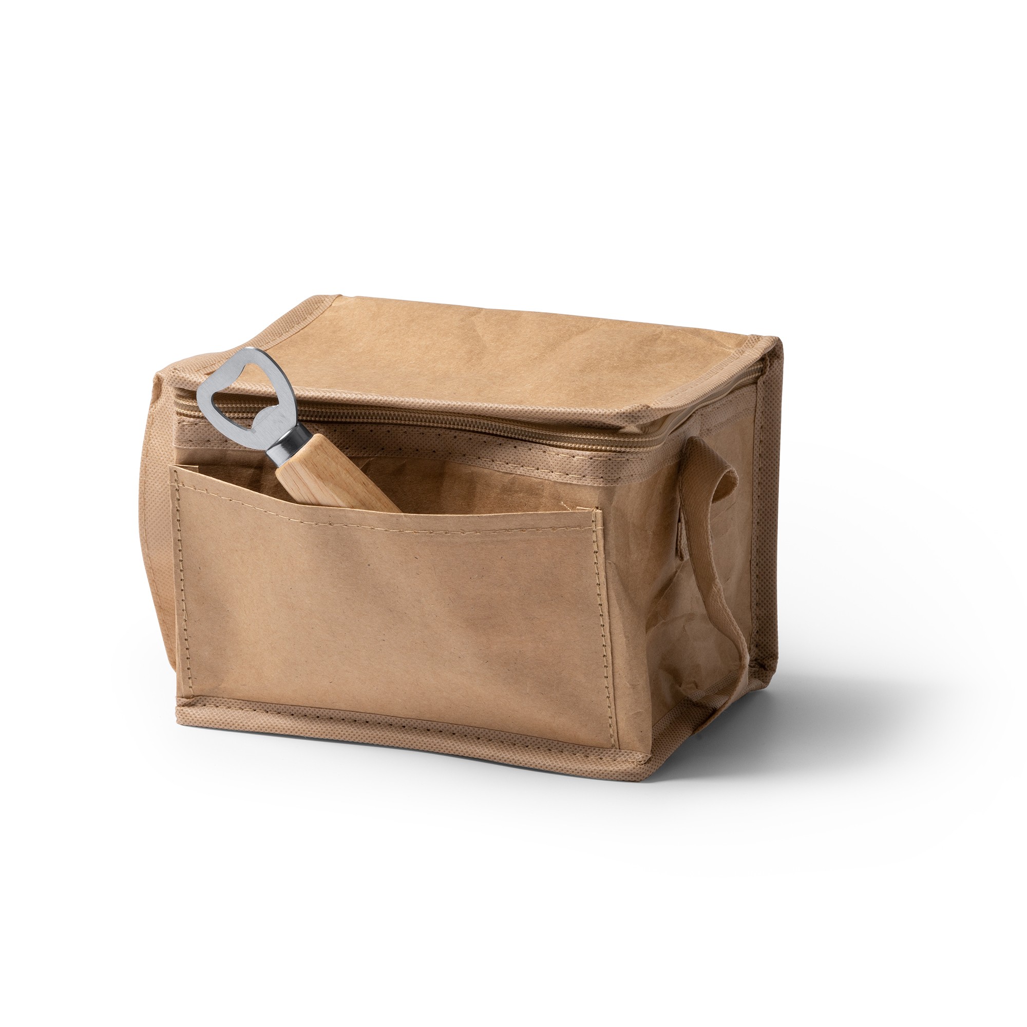 Cooler bag made of laminated kraft paper with isothermal aluminium lining and 2 mm insulating foam. 60 cm long handle and 3 litres capacity (6 cans). Flap with zip fastening and practical carry handle.