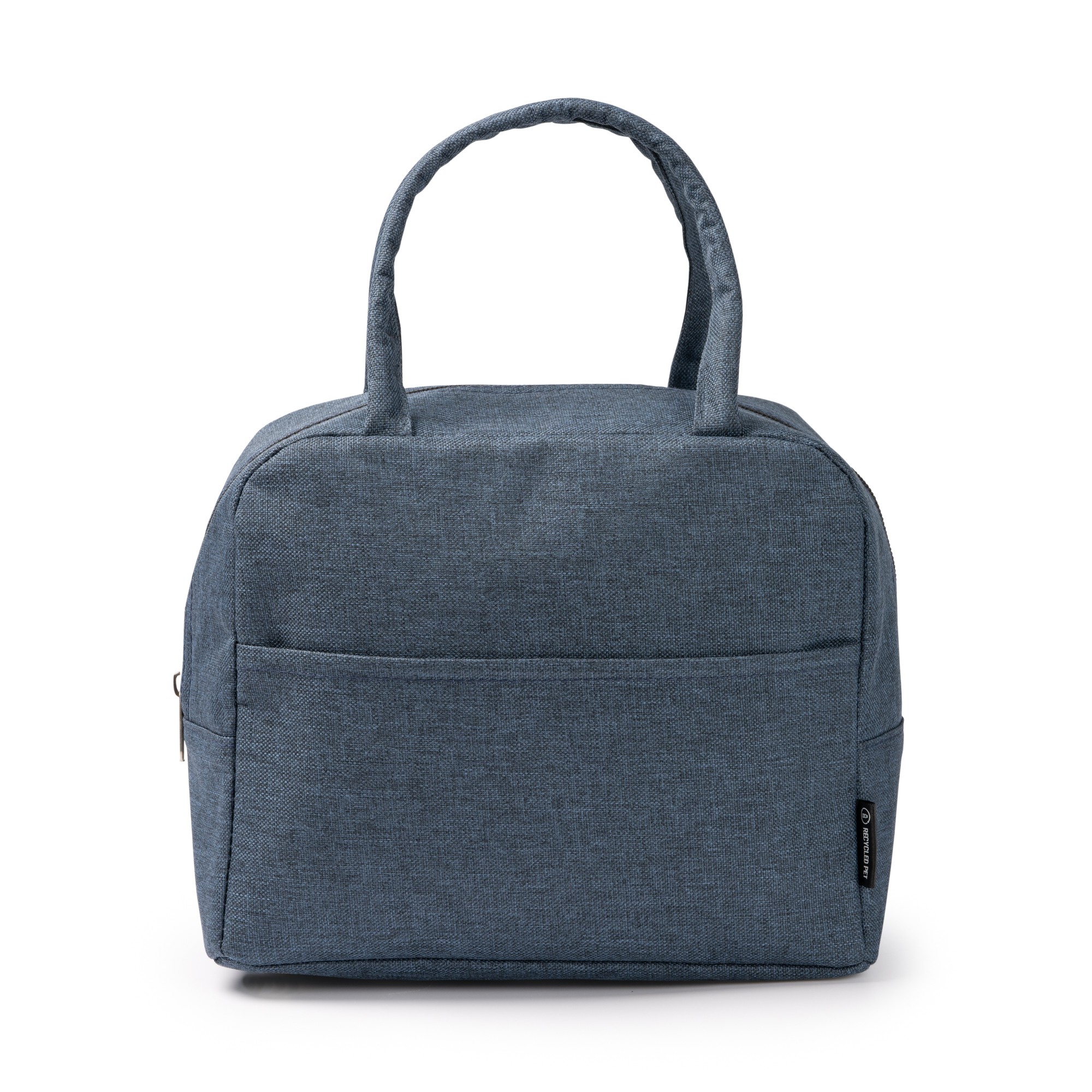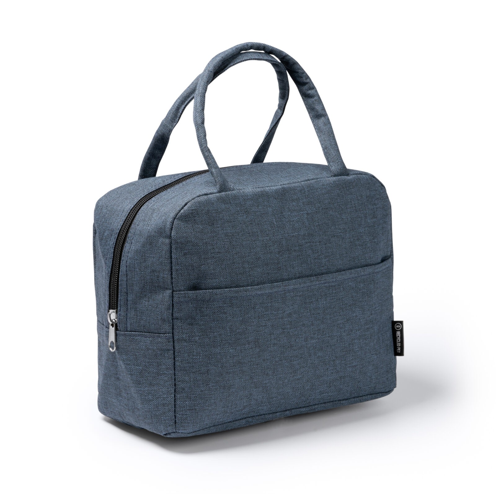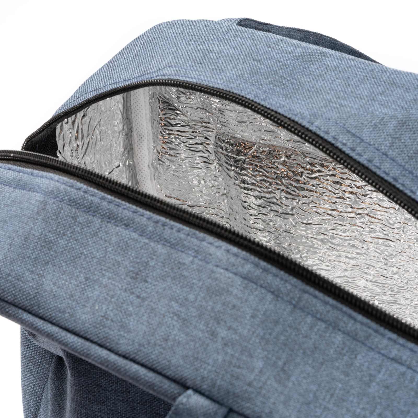 Cooler made of 600D RPET with isothermal interior. Front pocket and padded round handles.